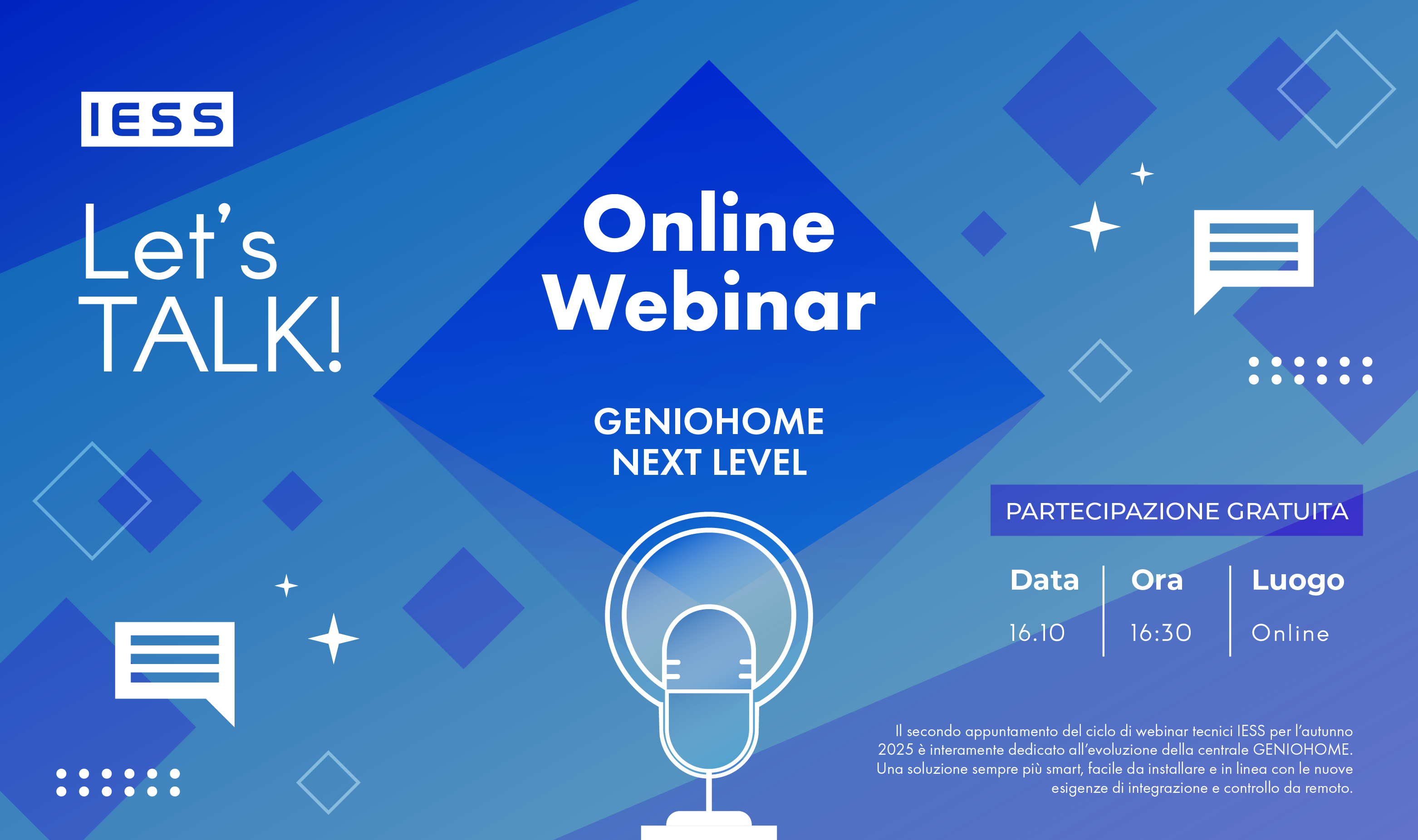 Il secondo appuntamento del ciclo di webinar tecnici IESS per l’autunno 2025 è interamente dedicato all’evoluzione della centrale GENIOHOME, pensata per il mercato residenziale.